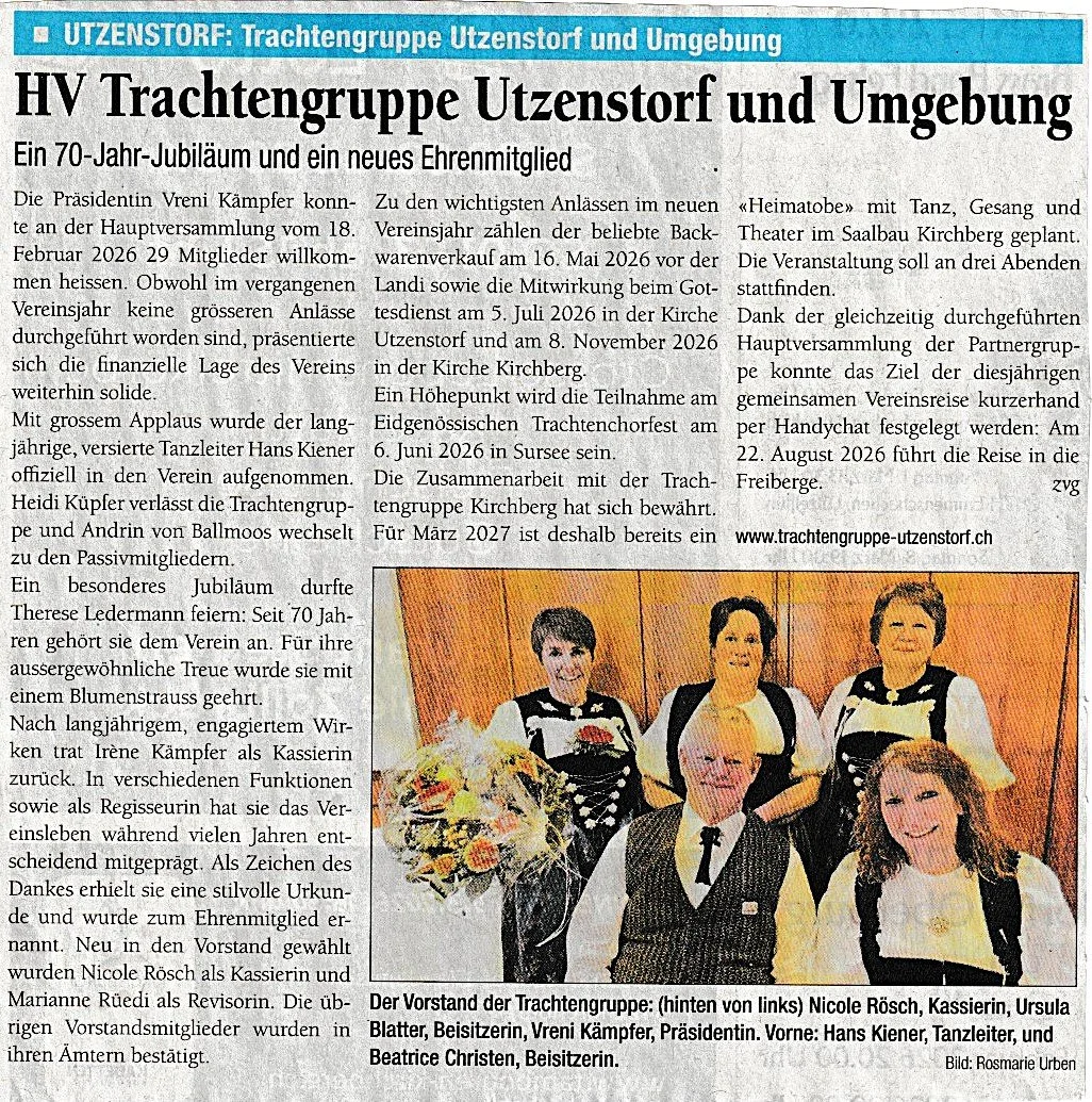 Hauptversammlung, Anzeiger Kirchberg, 27. Febr. 2025